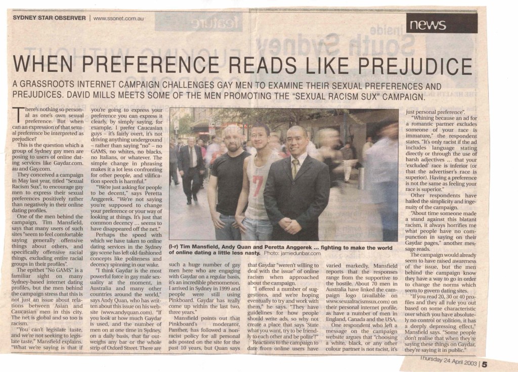 Very early on in the Sexual Racism Sux campaign, at article was published in the local LGBT newspaper, the Sydney Star Observer. In fact, it appeared in April 2003! For the sake of posterity and for the archives, here is the article: