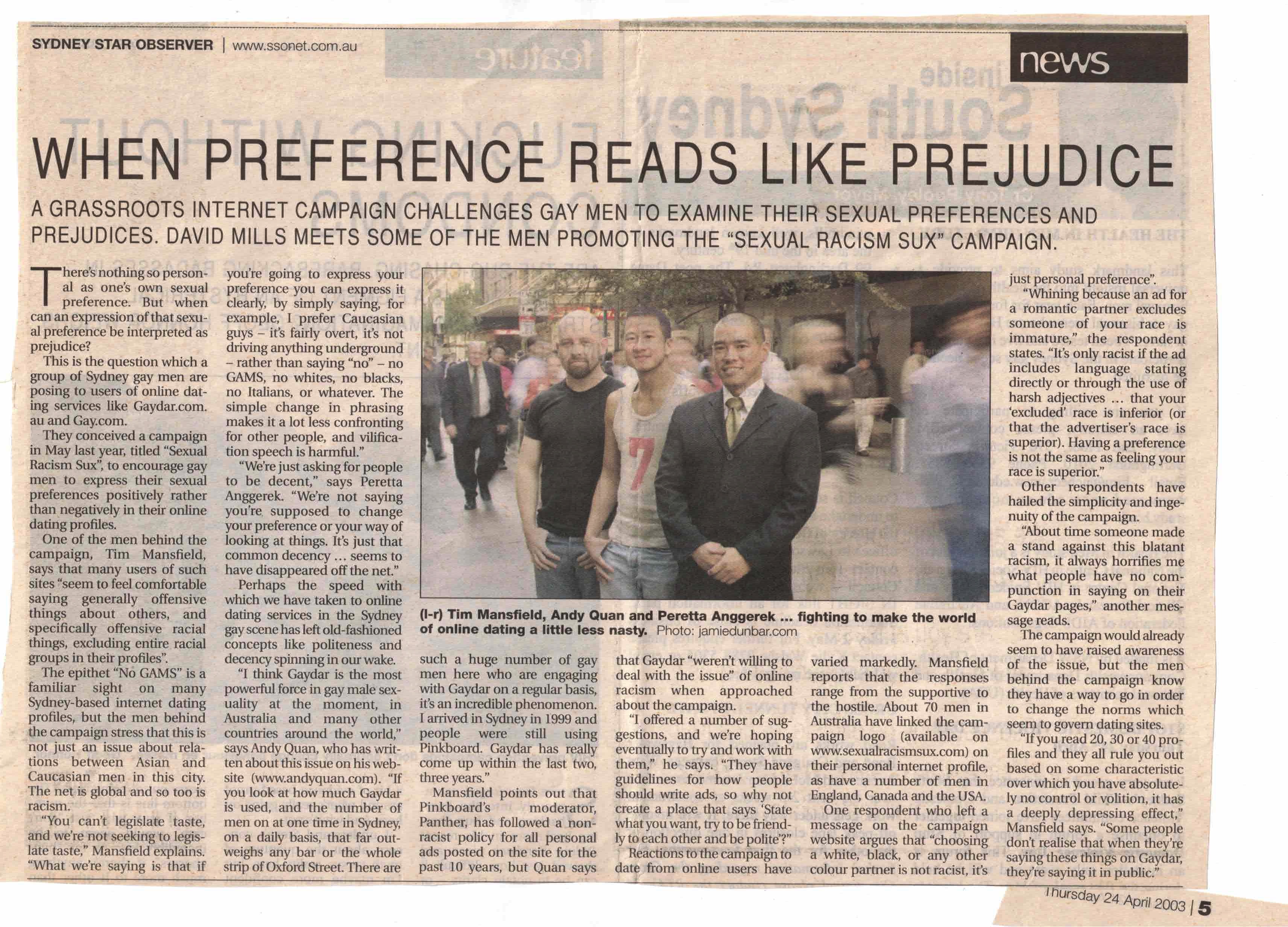 Very early on in the Sexual Racism Sux campaign, at article was published in the local LGBT newspaper, the Sydney Star Observer. In fact, it appeared in April 2003! For the sake of posterity and for the archives, here is the article: